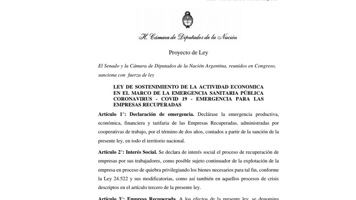 Entre los fundamentos del proyecto, especifica que «Resulta prioritario que en el contexto actual se ejecuten resortes urgentes de asistencia y sostenimiento de esta experiencia que resulta pieza indiscutida de la industria argentina y genera puestos de trabajo genuino en el país.»