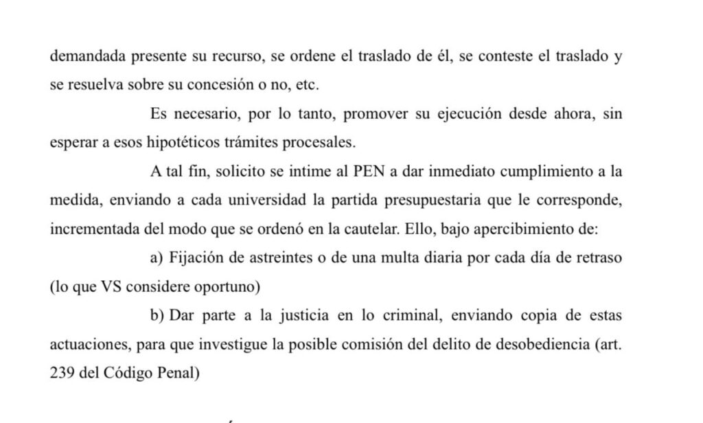 La presentación del recurso ordena al Gobierno cumplir la medida «bajo apercibimiento de la fijación de astreintes o de una multa diaria por cada día de retraso (en la transferencia de los fondos); y da parte a la justicia en lo criminal para que se investigue la posible comisión del delito de desobediencia, establecido en el artículo 239 del código penal.