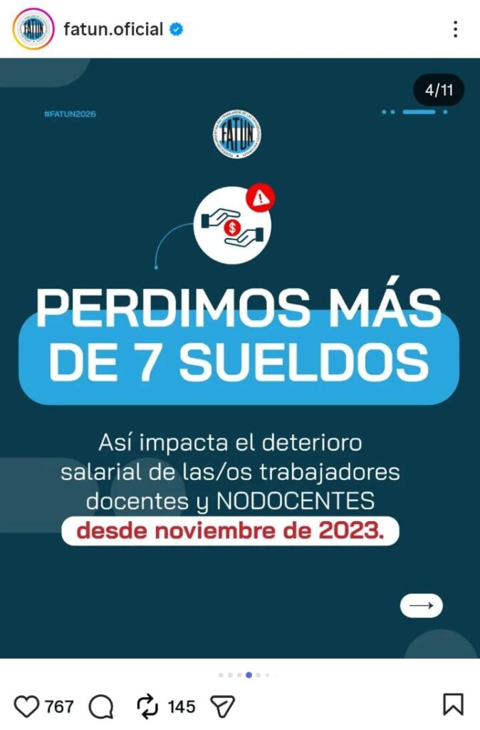 La medida fue impulsada en conjunto con la Federación Argentina del Trabajador de las Universidades Nacionales (FATUN), en reclamo de la «urgente convocatoria a paritarias y la recomposición salarial del sector, ante la pérdida del 48,7% del poder adquisitivo desde la asunción del presidente Javier Milei«.
