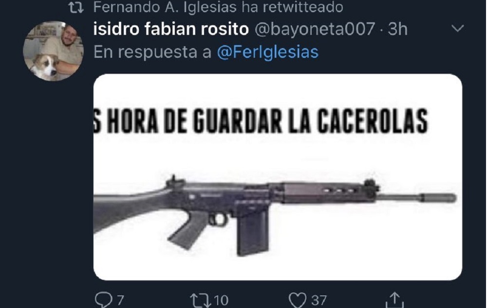 «Es hora de guardar las cacerolas», dice el mensaje que está acompañado por la imagen de un rifle. La publicación fue realizada por un usuario con pocos seguidores (¿uno de los famosos trolls del macrismo?) en respuesta a un comentario de Iglesias sobre los Moyano.