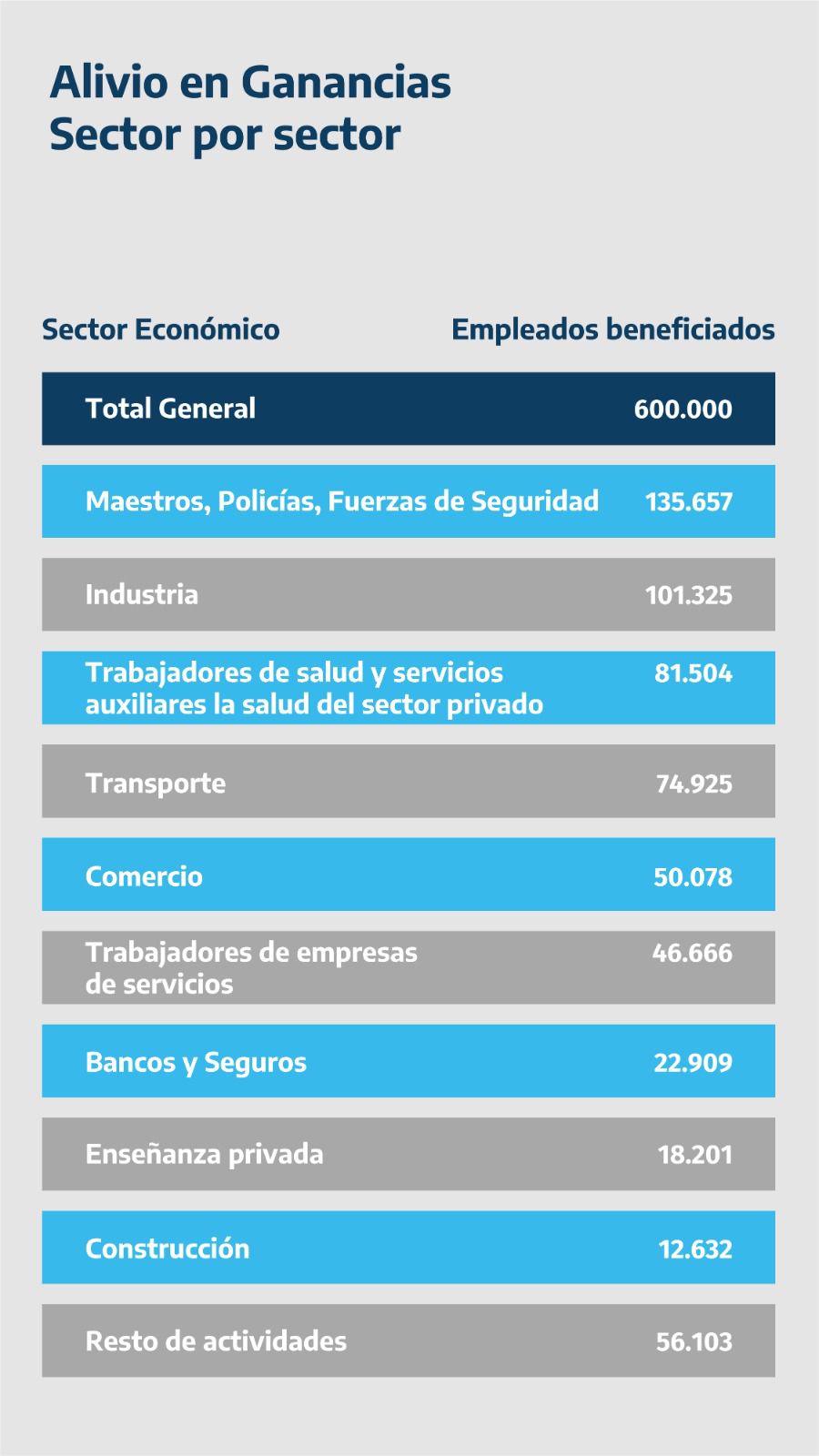 El acuerdo establecido entre el Palacio de Hacienda y la CGT permitirá que se beneficien 135.657 maestros, policías y fuerzas de seguridad; 101.325 empleos del sector industrial; 81.504 trabajadores de la salud y servicios auxiliares a la salud del sector privado; 74.925 empleados del transporte y 50.078 del comercio.