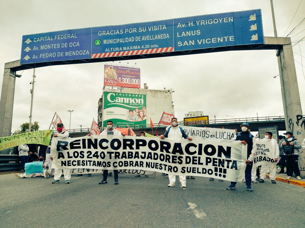 Trabajadores despedidos del Frigorífico Penta, ubicado en la localidad bonaerense de Quilmes, protestaban este mediodía en uno de los accesos al Puente Pueyrredón, en Avellaneda, en reclamo de la reincorporación de 240 cesanteados, en el contexto de un conflicto que lleva más de tres meses.