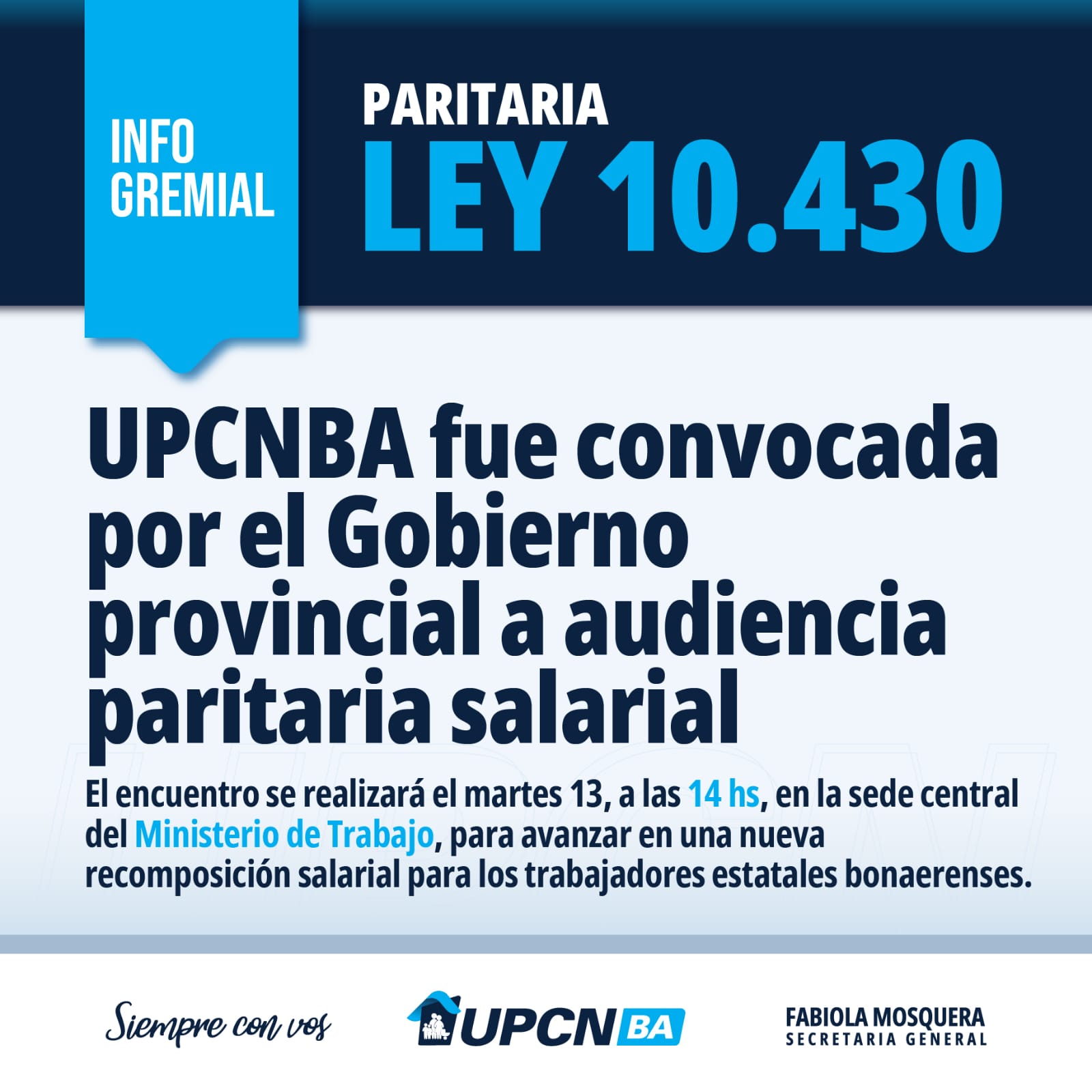 La Unión del Personal Civil de la Nación, Seccional Provincia de Buenos Aires (UPCNBA) que encabeza Fabiola Mosquera, fue convocada por el Gobierno provincial a una audiencia paritaria salarial en el marco de lo establecido por la Ley 10.430, que regula las relaciones laborales del personal estatal bonaerense.