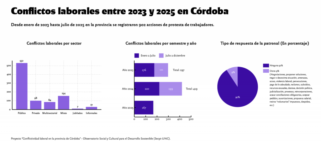 Un trabajo realizado por un equipo multidisciplinario de la Universidad Nacional de Córdoba detectó que entre enero de 2023 y julio de 2025 se visibilizaron 902 conflictos laborales. En 2023 fueron 297 conflictos. Esa cifra subió a 419 en 2024. Con datos hasta julio, en 2025 se registraron 186.