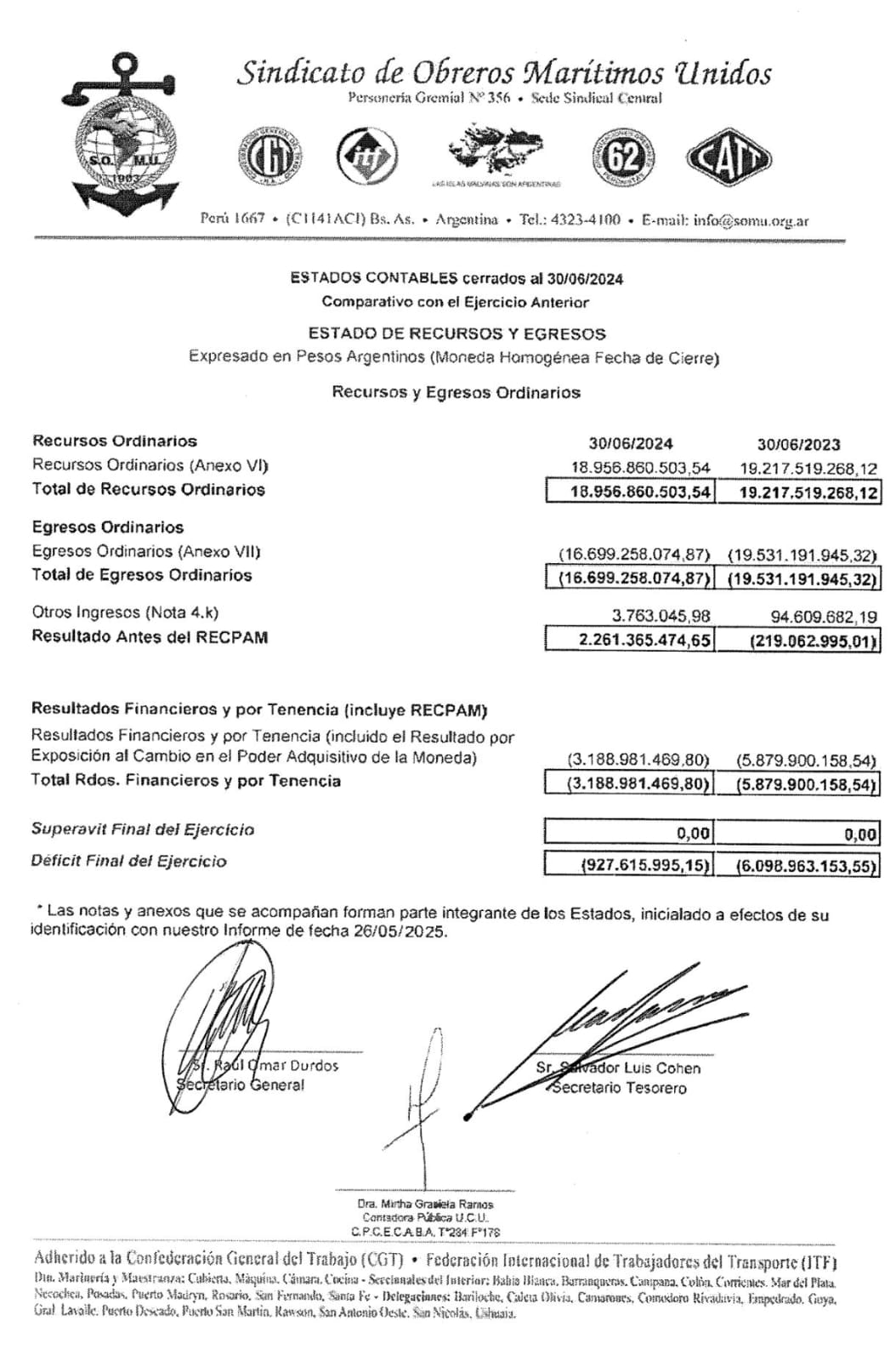 Amplía Molina: «La forma en que se firmó esta Memoria y Balance es grave porque deberían haber firmado los 6 revisores de cuenta titulares y en caso de no estar, no poder o no querer deben de llamar a los suplentes y firmaron solo los 3 afines a Durdos. Los otros no fueron convocados ni siquiera para poder verlo y dar su opinión ya que pertenecían a la oposición y para colmo presentan una documentación que indica que se aprobó por unanimidad». Sigue: «Tampoco lo presentaron a los afiliados y cuando se le reclamó al Secretario de Interior, Hernán Decorte llamó a sus abogados y le dieron la directiva de no entregar nada a nadie».